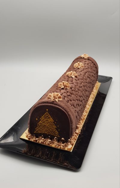 Dacquoise amande /noisette, insert crémeux chocolat, Insert bananes flambées, croustillant crumble, mousse vanille, glaçage velours brun