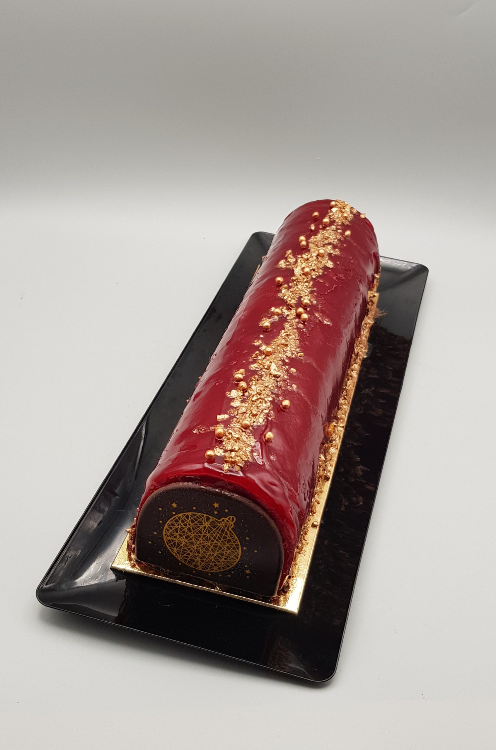 Génoise chocolat, palet framboise, Insert mousse chocolat au lait, mousse chocolat noir, glaçage transparent