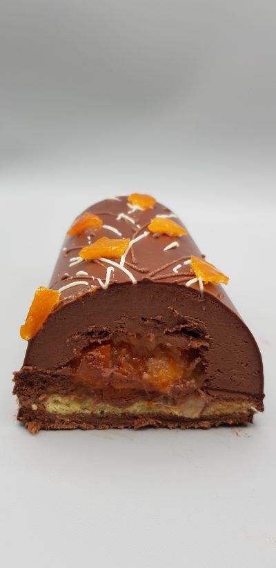 Génoise chocolat, insert marmelade orange, croustillant praliné, mousse au chocolat, glaçage chocolat noir