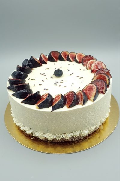 Cake aux myrtilles, insert figues, mousse à la lavande, glaçage velours blanc.