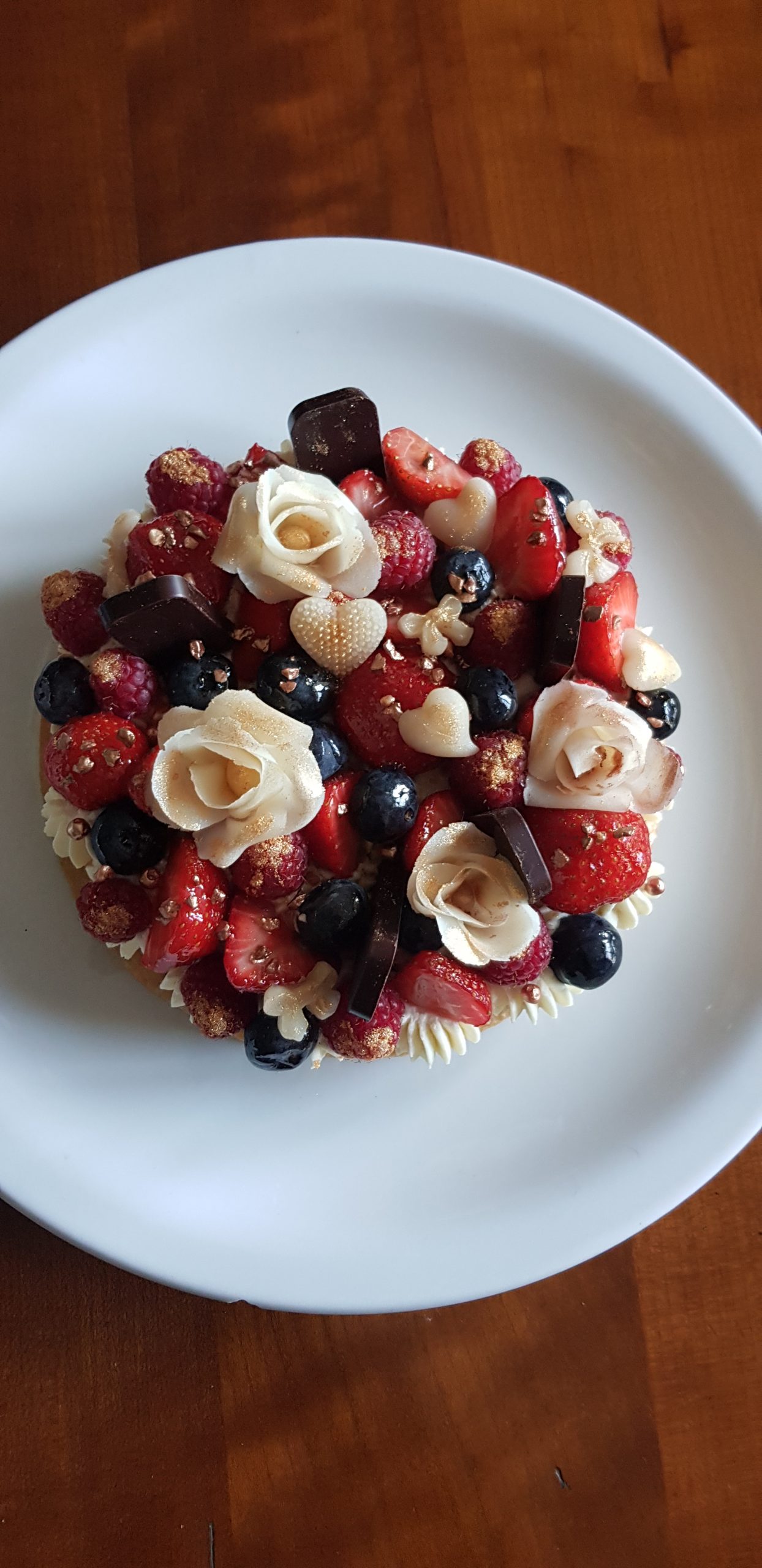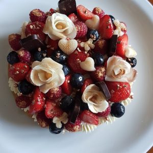 Fruits ou Chocolat – Pâte sablé amande, ganache montée vanille ou chocolat (suivant version), décor fruits ou chocolat