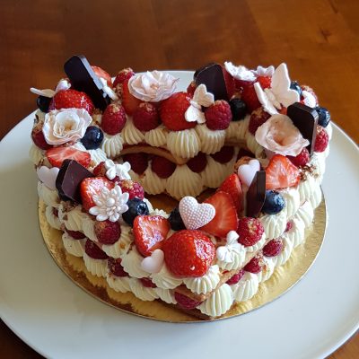 Tarte définie avec le client sur le choix des lettres ou du nombre ainsi que du parfum de la garniture à partir de 8 parts.