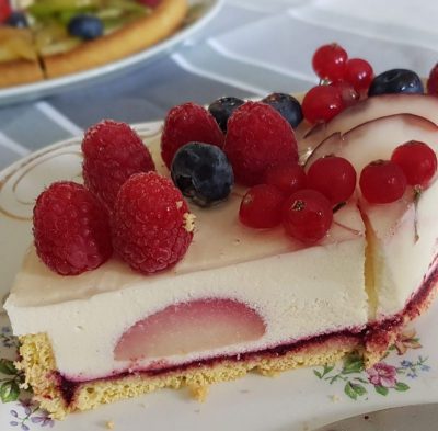 Biscuit cuillére, mousse nectarine, nectarines pochées, confit fruit rouge, glaçage neutre.