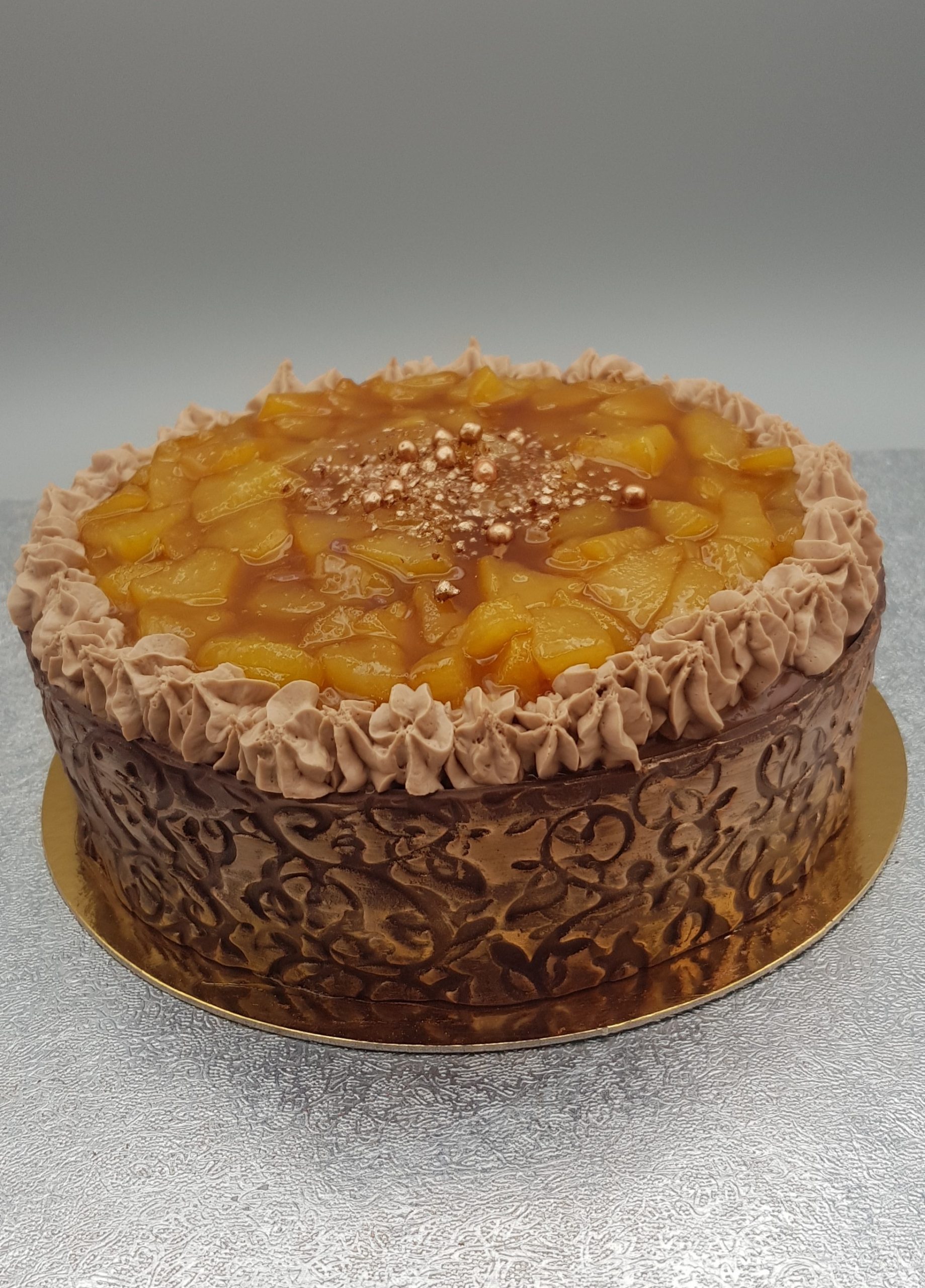 Entremet mousse chocolat noir, insert poire/caramel, biscuit noix de pécan, glaçage chocolat tendre.