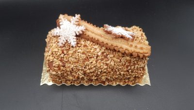 Dacquoise noisette, praliné chocolat blanc et lait, praliné chocolat noir et lait, croustillant praliné, glaçage noisettes