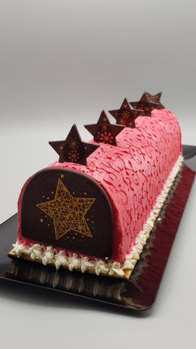 Dacquoise noisette / amande, insert fruits rouges, insert mousse chocolat au lait, mousse à la rose, croustillant muesli fruits rouges, glaçage velours rose