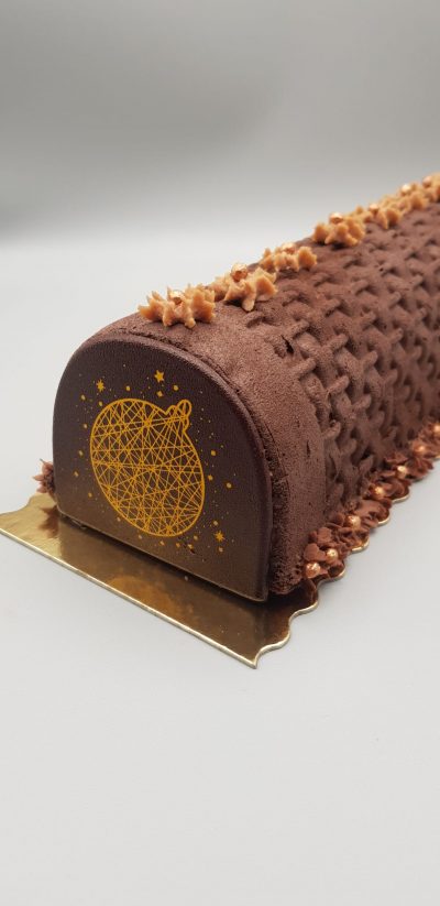 Biscuit Sacher amande, mousse chocolat noir, mousse chocolat au lait, mousse chocolat blanc, glaçage velour brun